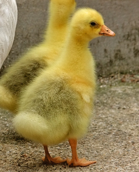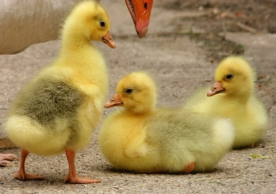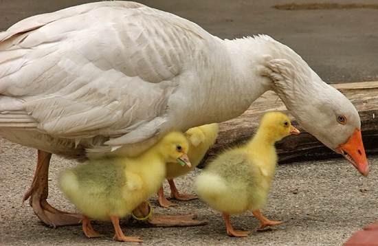 Potomstvo si pred nami dospelá hus chráni, malí sa jej stále pletú pod nohami